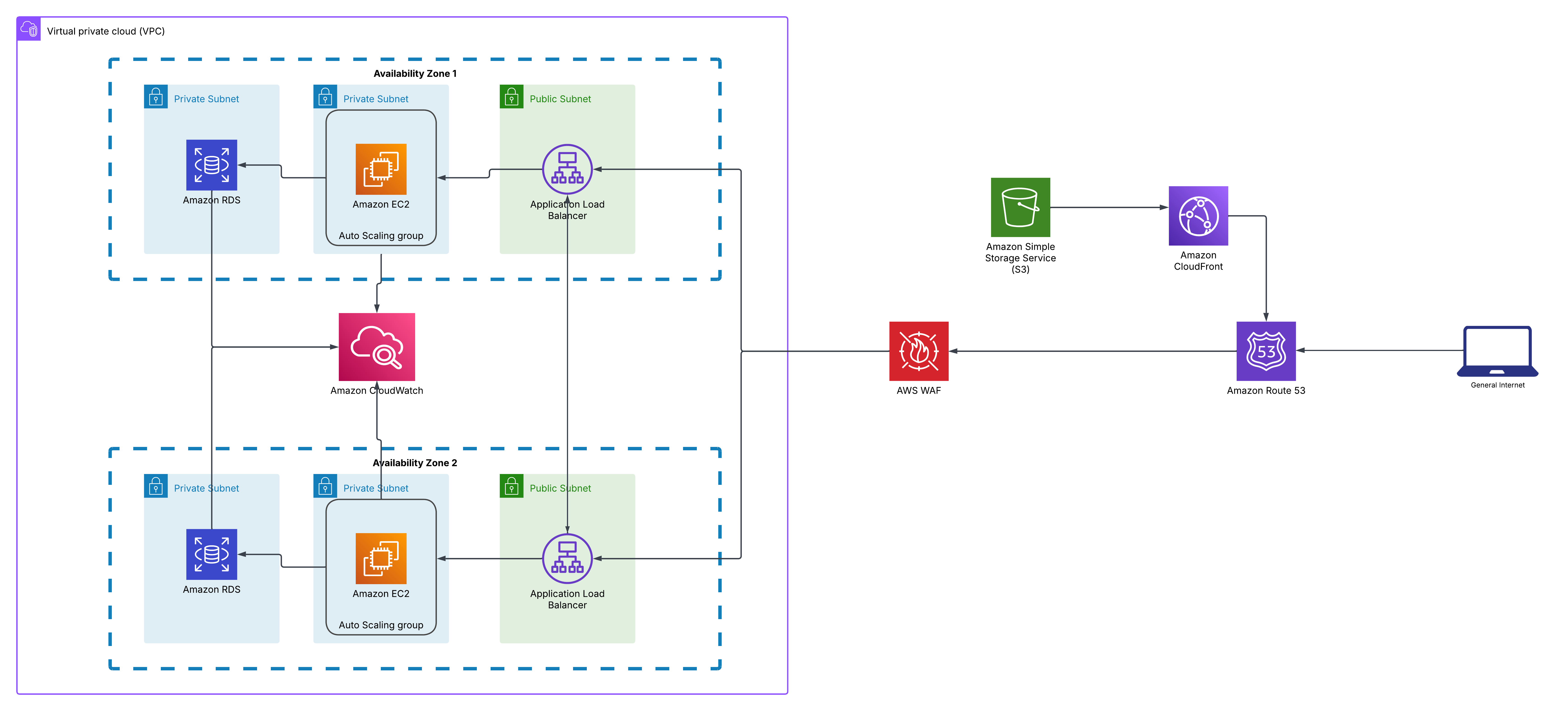 We implemented a multi-tier architecture within a custom VPC, segregated into public, private, and database subnets across two availability zones:
