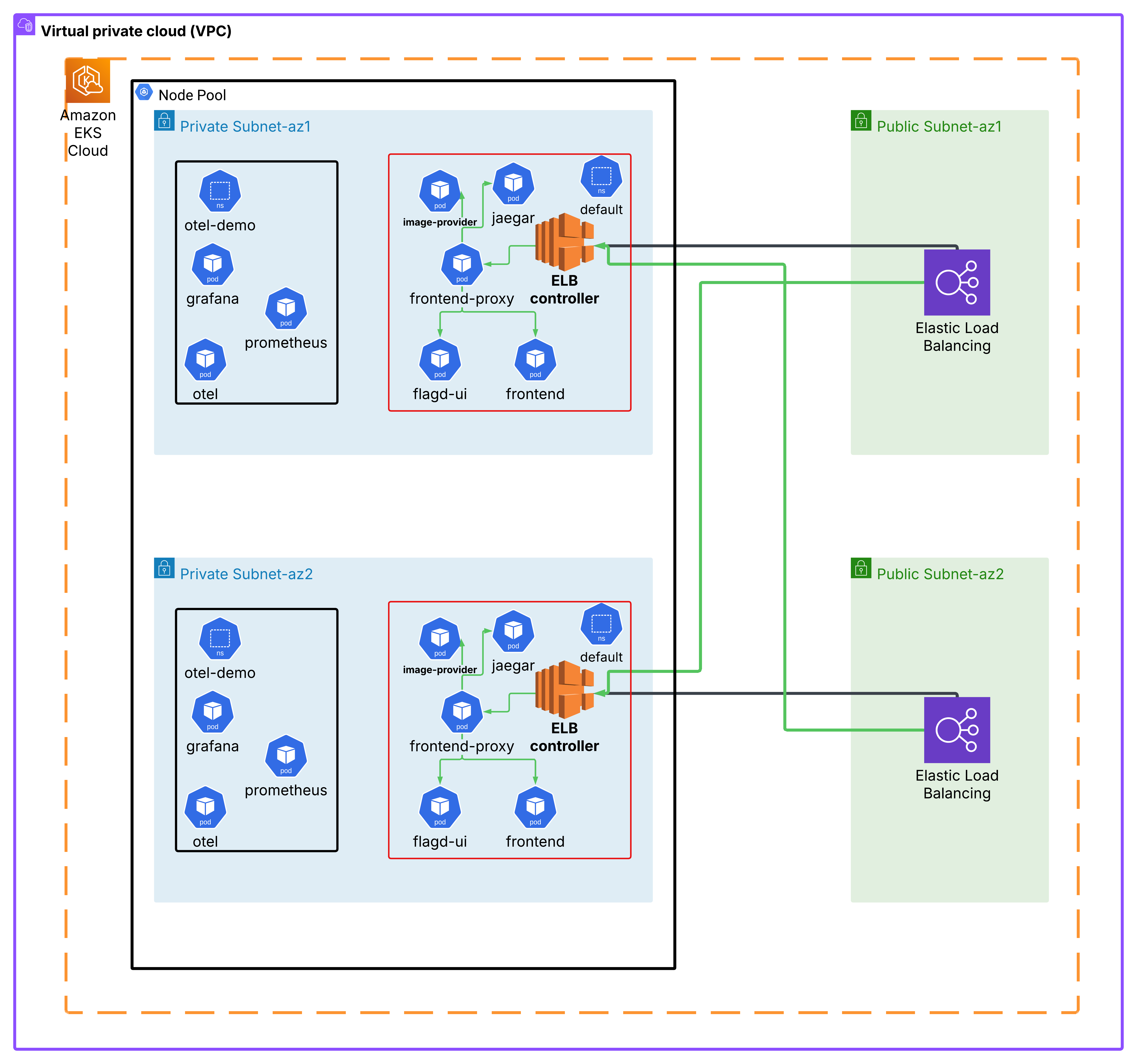 After successful validation, the team transitioned to the production deployment on Amazon EKS with the following components:
